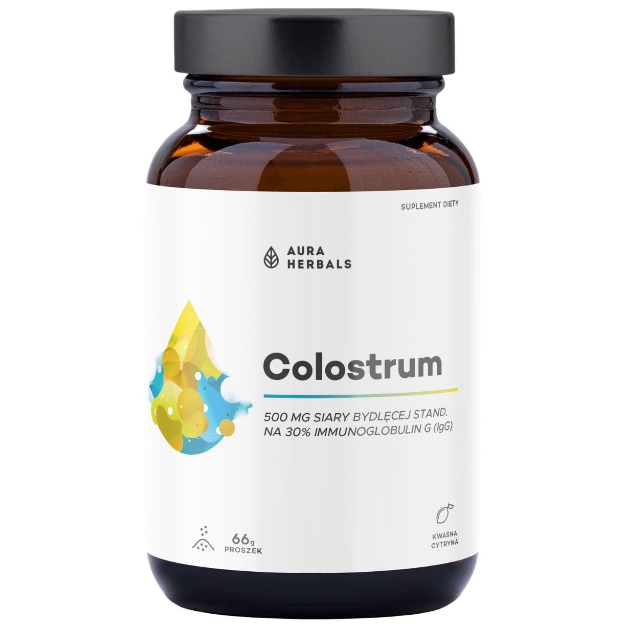Aura Herbals Colostrum 500 mg is a powdered dietary supplement with a sour lemon flavor, containing freeze-dried bovine colostrum. One serving (1.1 g) provides 500 mg of colostrum standardized to 30% immunoglobulin G (IgG = 150 mg). Raw material from Polish farms from the 1st and 2nd milking. Package 66 g = 30-60 servings. Contains milk.