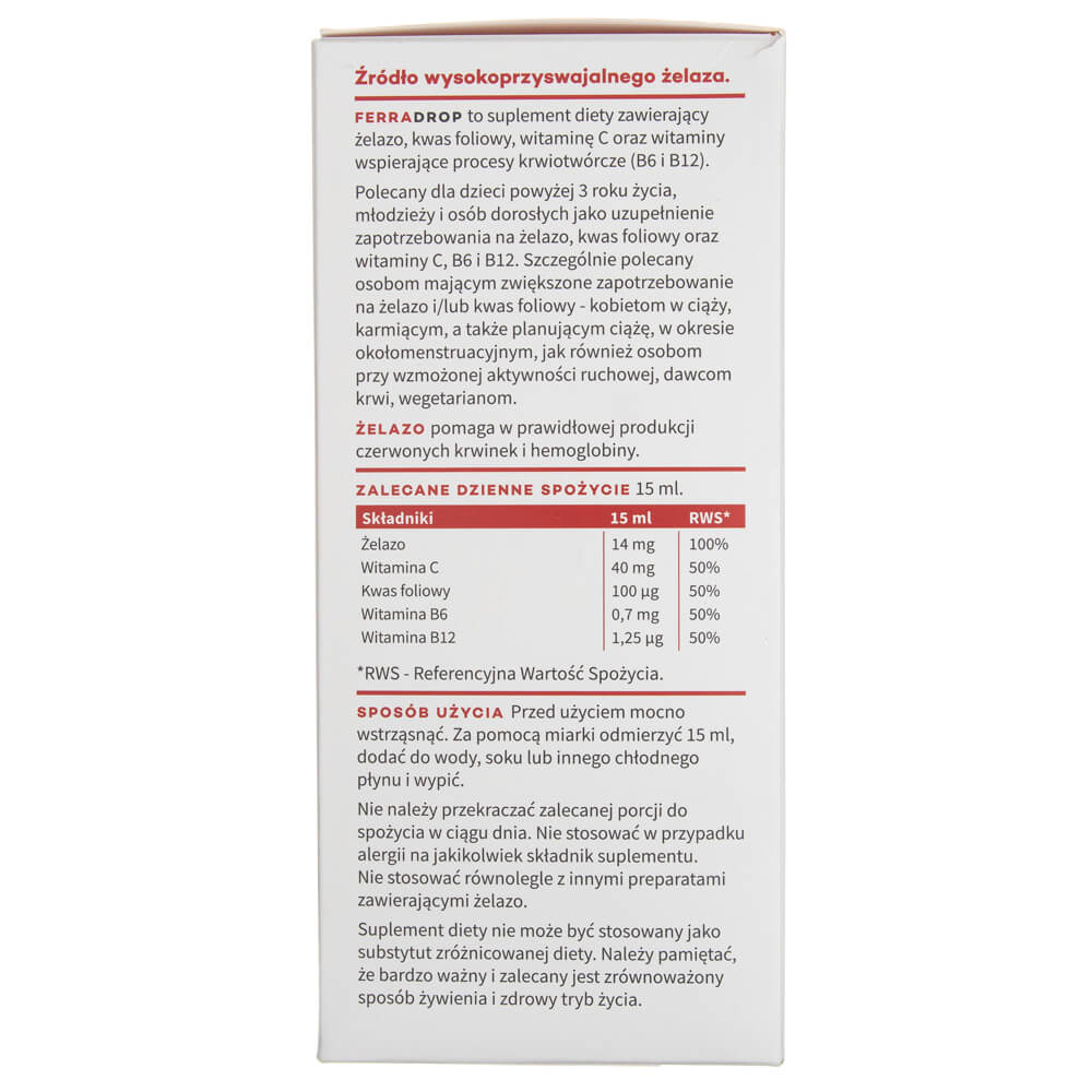 Ferradrop is a dietary supplement from Aura Herbals containing iron + vitamin C + vitamin B6, B9 and B12. Special properties of iron supports the correct production of red blood cells and haemoglobin supports the correct functioning of the immune system assists in maintaining the correct cognitive functions reduces the feeling of fatigue and weariness Special properties of folic acid (vitamin B9) folates support the correct functioning of the immune system folates assist in the correct blood production folates contribute to maternal tissue growth during pregnancy folates take part in the process of cell division