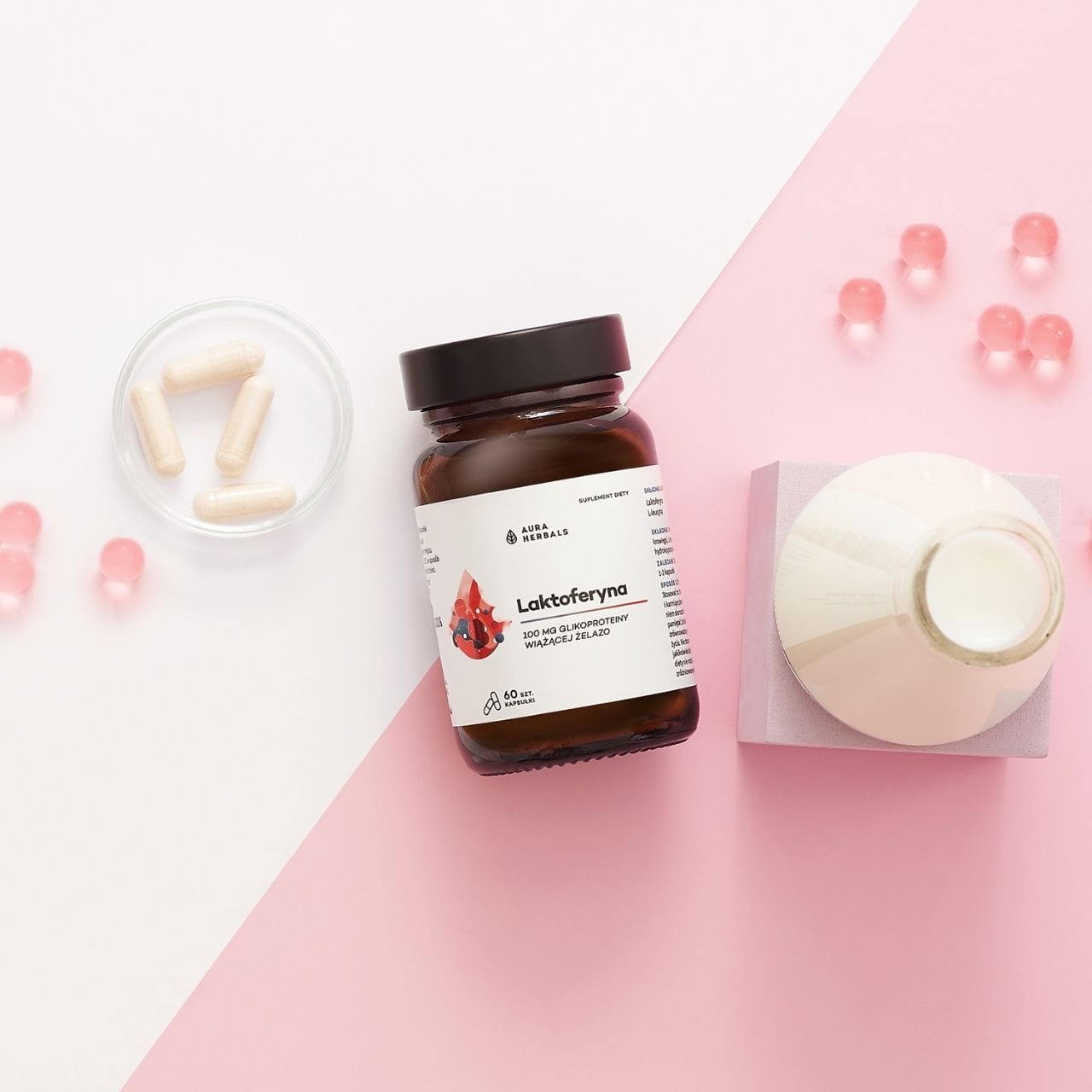 Aura Herbals Lactoferrin is a dietary supplement in HPMC capsules containing 100 mg of lactoferrin (in 1 capsule) or 200 mg (in 2 capsules) obtained from cow's milk. Clean label composition – no artificial colours or preservatives. Contains milk (allergen). Does not contain: gluten, soya, GMOs, preservatives, artificial colours or sweeteners.