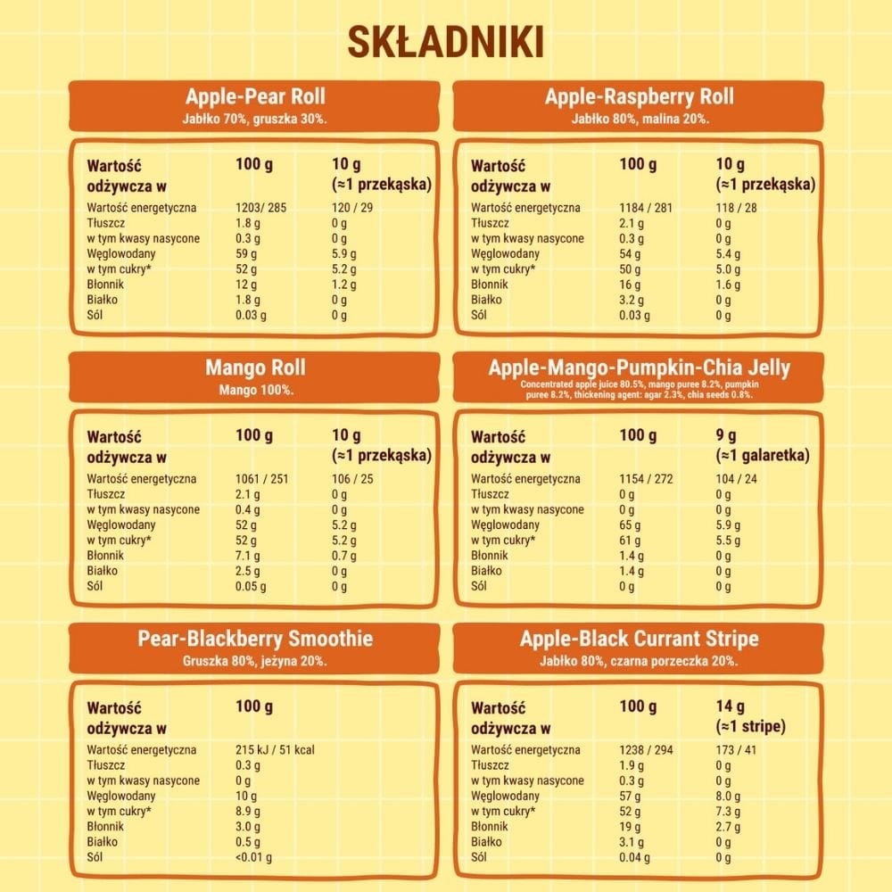 • Apple-Mango-Pumpkin-Chia Jelly (ingredients: 80.5% concentrated apple juice, 8.2% mango puree, 8.2% pumpkin puree, thickening agent: 2.3% agar, 0.8% chia seeds).