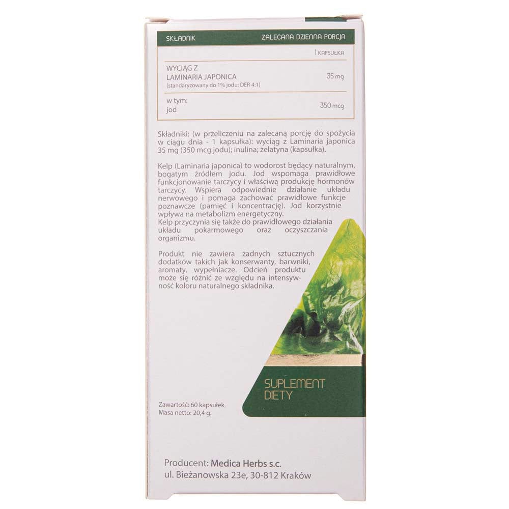 Kelp from Medica Herbs is a dietary supplement in capsules, containing an extract extract extracted from Laminaria japonica standardized to contain 1% iodine.