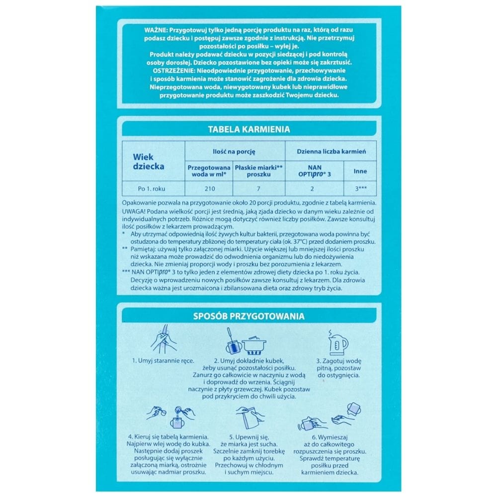 Prepare only one portion of milk at a time, which you will feed to your child immediately, and always follow the instructions. Do not keep leftovers from a meal – pour them away. Always support your child while feeding. A child left unattended may choke.