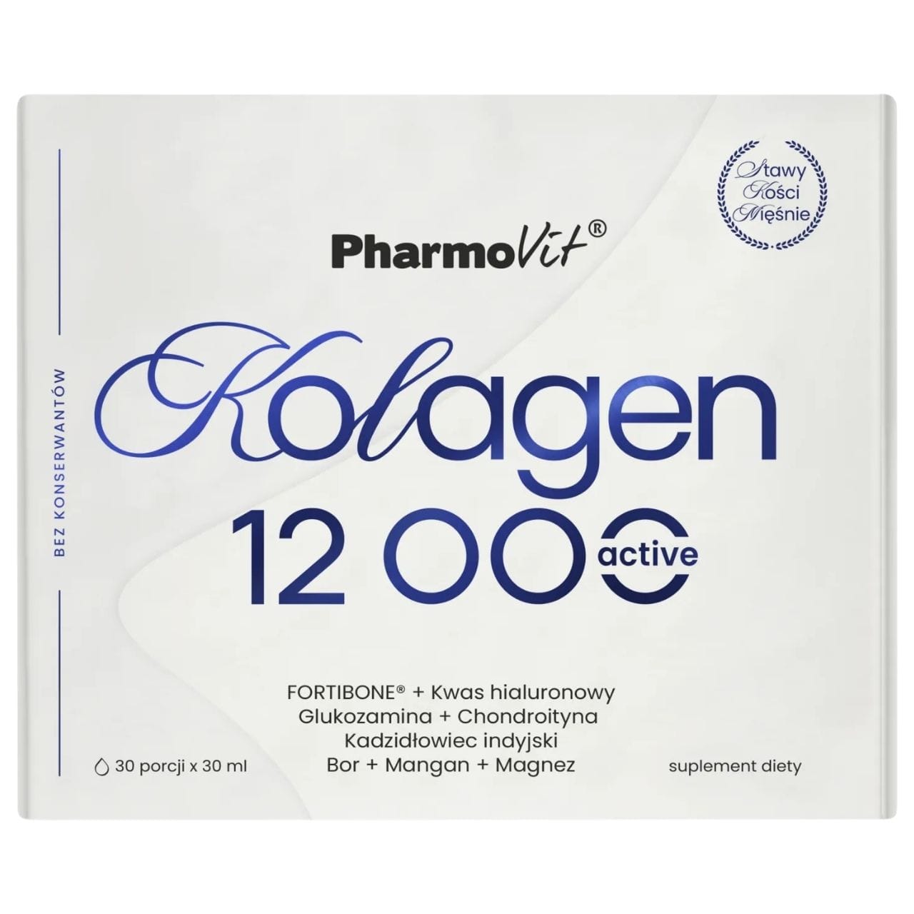 PharmoVit Collagen 12000 Active is a dietary supplement in liquid form (30 ml ampoule) containing hydrolysed bovine collagen (7000 mg) and FORTIBONE® (5000 mg), glucosamine (150 mg), chondroitin sulphate (200 mg), hyaluronic acid (50 mg) and MSM (200 mg). Vitamin C (160 mg, 200% RDA) contributes to normal collagen production for the normal function of skin, bones and cartilage. Vitamin D (1000 IU, 500% RDA) contributes to the maintenance of normal bones. Manganese contributes to the normal formation of connective tissue. Product for adults. Fruity flavour (tropical fruits with a hint of lemon). Does not contain: colourings, gelatine, gluten.