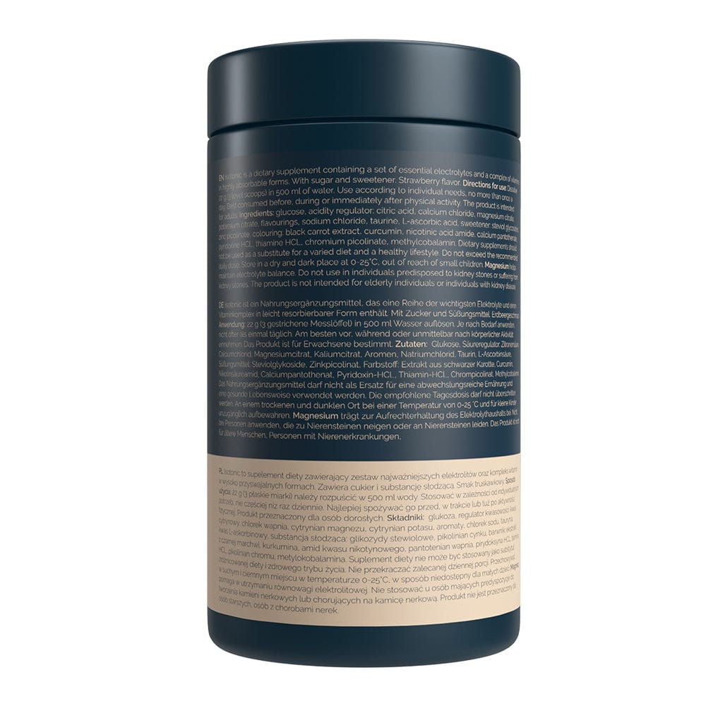 Glucose, acidity regulator: citric acid, calcium chloride, magnesium citrate, potassium citrate, aroma, sodium chloride, taurine, L-ascorbic acid, sweetener: Steviol glycosides, zinc picolinate, colour: black carrot extract and curcumin, nicotinic acid amide, calcium pantothenate, pyridoxine HCL, thiamine HCL, chromium picolinate, methylcobalamin.