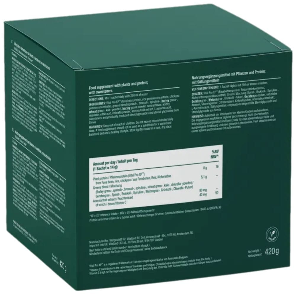 Vitalised Greens & Protein is a powdered food supplement in convenient sachets. A complex of superfoods and plant-based protein. One serving provides 14g of powdered green leafy vegetables and premium plant-based protein. The product is suitable for vegans, is GMO-free and has a pleasant taste, naturally sweetened with stevia.