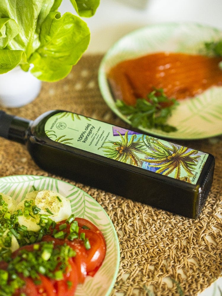 High-quality, unpurified, cold-pressed hemp oil should be consumed cold and stored in the refrigerator. The oil must not be subjected to heat treatment. The product should be consumed directly from the spoon or as an accompaniment to cold dishes. Due to its pronounced flavour, hemp oil goes particularly well in salads with fresh, crunchy vegetables. It can also be poured over bread or used as a base for toppings such as pesto. If you wish to combine hemp oil with cooked dishes, add it only after they have cooled down. The oil can also be applied directly to the skin and hair or used to enrich creams, masks and conditioners.